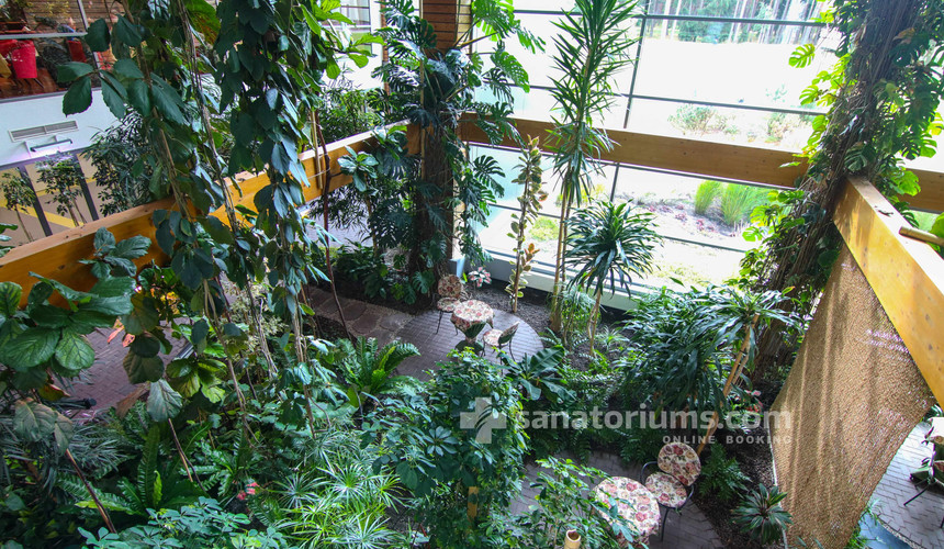 Расположен в хвойном лесу, имеет собственный бальнеологический центр с минеральным бассейном, саунами, джакузи, соляной пещерой и широким перечнем процедур — от криотерапии до грязевых и кислородных терапий.