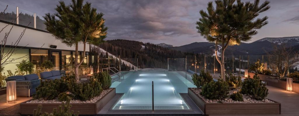 Современный wellness-комплекс с бассейнами, spa-процедурами и просторными номерами. Здесь всё про баланс: утро в горах, день у бассейна, вечер с видом на ели и снег.